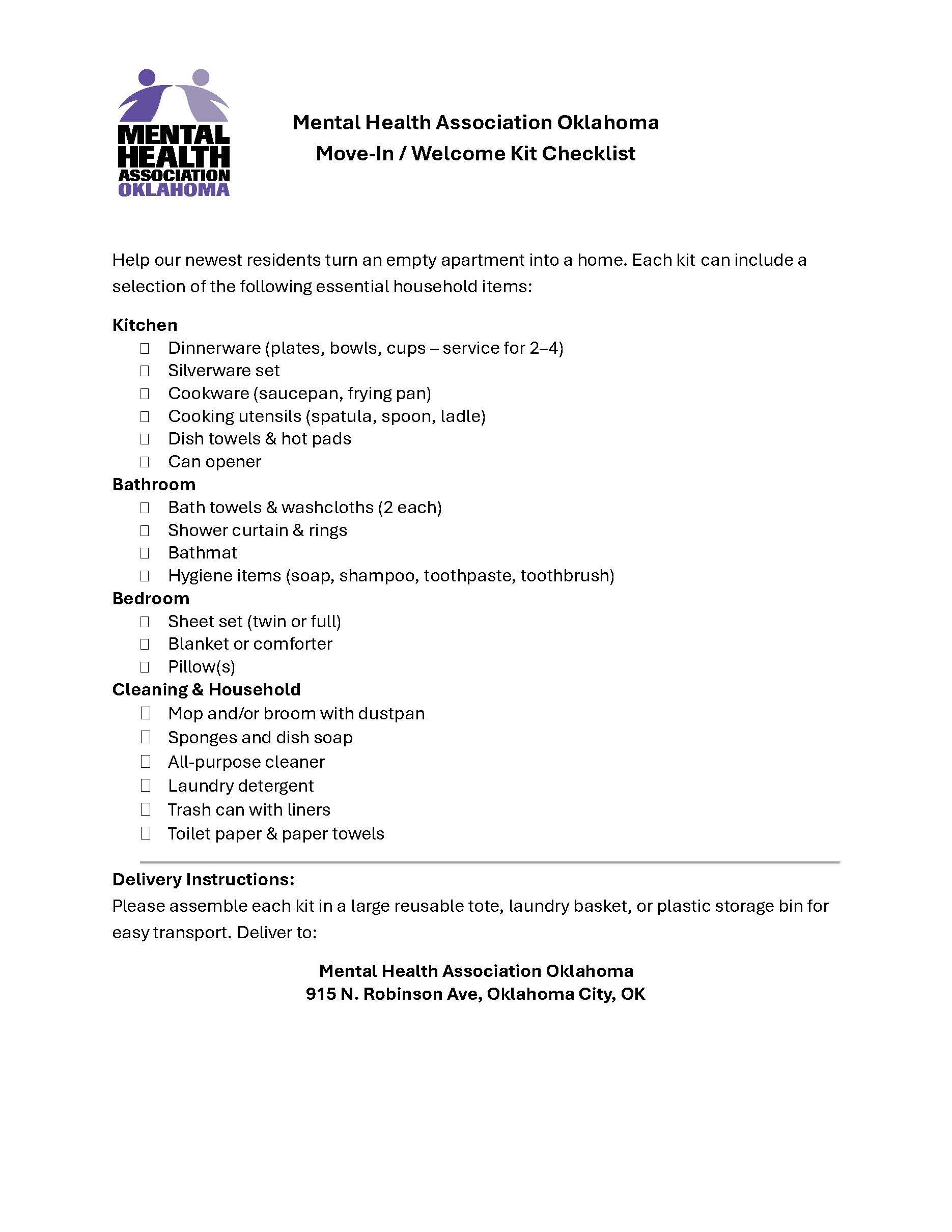 At Mental Health Association Oklahoma (MHAOK), we believe housing is health care. In 2024 alone, 234 individuals across Oklahoma transitioned from homelessness into stable housing with the support of our programs. These are neighbors who were once living in shelters, encampments, or on the street, now gaining a safe, supportive place to call home. While funding for our programs provides rental assistance and supportive services, it does not allow for the purchase of basic household goods. That means when someone moves in, they often do so without essentials like pots and pans, bath towels, bed linens, or cleaning supplies.