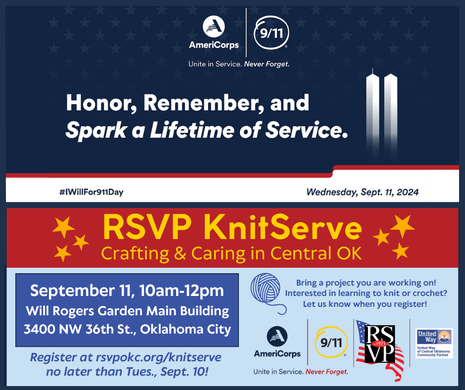 RSVP of Central Oklahoma, Inc.’s 9/11 Day of Service event will be held from 10:00 am to noon on Wednesday, September 11, in the Will Rogers Gardens Main Exhibition Building. Anyone interested in attending may register by visiting https://rsvpokc.org/knitserve or emailing hello@rsvpokc.org before Sept. 10.